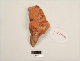 | Description / विवरण | Fragment of handmade terracotta human hand, applique bangle but partly broken, fingers are missing, decorated bangle with groove and incised line, slip treatment given on surface in red colour. |