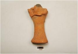 | Description / विवरण | A handmade terracotta female figurine with partly smooth surface, protuding conical breast, applique decoration on neck, cylindrical body with flared base, concave interior and partly broken hands, well baked, medium fabric with traces of red slip. |