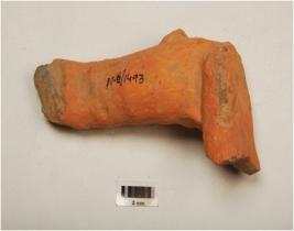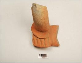| Description / विवरण | A handmade terracotta fragment of heman leg with smooth surface, depicted wearing anklet, fingers indicated by five groove lines and thick leg placed on base, ill , medium fabric with traces of dark red slip. |