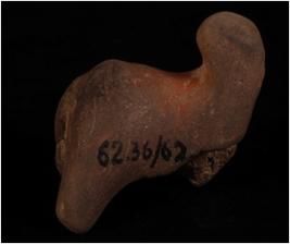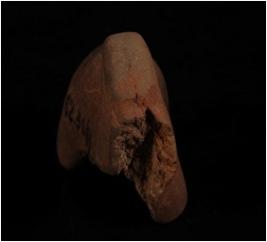 | Description / विवरण | A fragment of elephant figurine with incised lozenge shaped eyes and embossed beaded design, legs are broken and missing. |