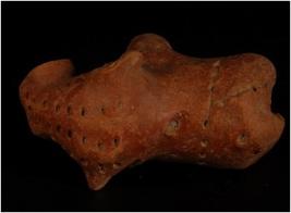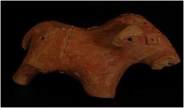 | Description / विवरण | Elephant animal figurine. Traces of red slip. It has pin hole design with vertical lines around head. Tail is intact pierced hole lines around body and hind portion pin hole in ears. Ears partly broken. Tusk and teeth missing. It has cubical incised eyes with a hole to represent eye ball. |
