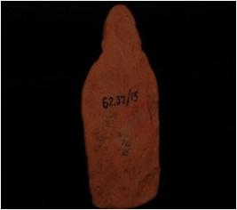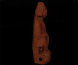 | Description / विवरण | Terracotta human seated figurine three hole in left, right and center in lower side has long hair, wearing drappery in lower part. |