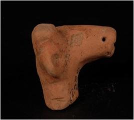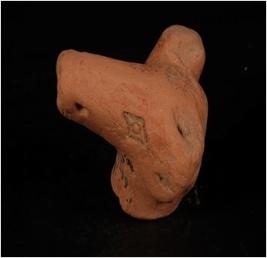 | Description / विवरण | A handmade terracotta fragment of a animal head decorated with embossed design and lozenged shaped eyes, right ear is intact, elonglated snout, incised mouth nostrils, and perforation on nose. |