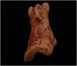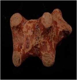 | Description / विवरण | A terracotta humped bull, prominent hump, broken horns and legs, other details are lacking, surface treated with red slip and pin hole eyes. |