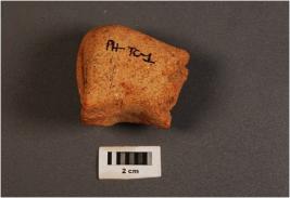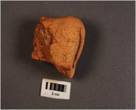 | Description / विवरण | Handmade terracotta hind portion of animal figurine, intacted tail, broken legs, rough surface, treated with red wash. |