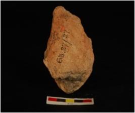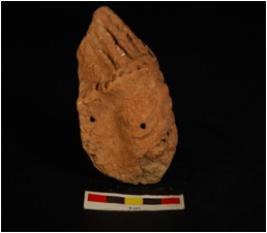 | Description / विवरण | Fragment of terracotta human head, headdress decorated with groove lines and pin holes, eyes, nose and ear are indicated by holes, mouth is suggested by grooves line and wash treatment is given in dull red colour. |