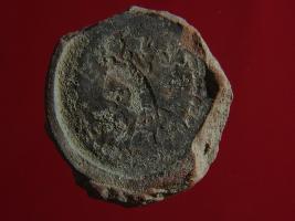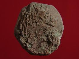 | Description / विवरण | Trench DX-2, Stratum Layer 3 Coin mould made of terracotta almost circular in shape. Surface is rough and is broken from a side. Appearance is of grey colour. Standing human figurine in tribangha posture with a pot and devotees is being depicted centered by bead pattern. Mould was certainly used for casting purpose. |