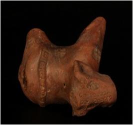 | Description / विवरण | Handmade terracotta fragment of animal figurine, made with well levigated clay, stamped circular design over body, embosed circular design on head, diamond shaped eyes, fore right leg is intact, legs and tail are broken, slip treatment is given in red colour. |