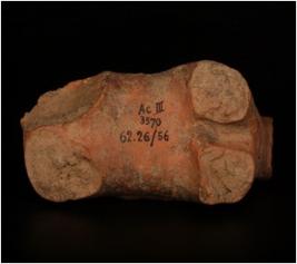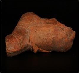 | Description / विवरण | Terracotta fragment of horse. Head, Legs and tail are missing. Incised and pin hole design on the body. |