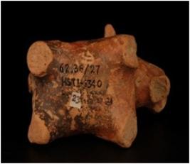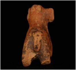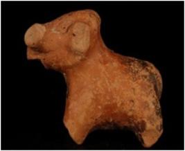 | Description / विवरण | Terracotta elephant figurine decorated with incised lozenge shaped eyes and beaded desing. Tail is intact. Legs are half broken and missing pin holes on body. |