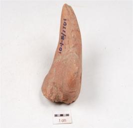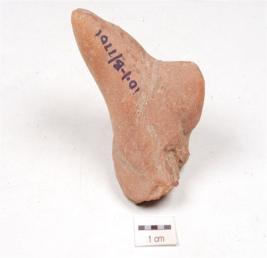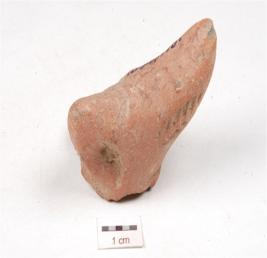 | Description / विवरण | A handmade terracotta indeterminate object, partly broken having floral motif on surface, conical top, well baked, surface treated with red slip and incised lines around bottom. |