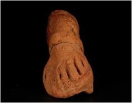 | Description / विवरण | Human hand portion wearing a bracelet holding a bowl. Incised fingers Hand moulded human figure. |