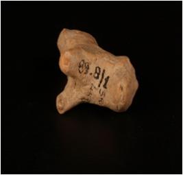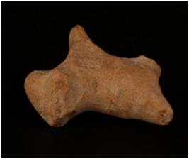 | Description / विवरण | Terracotta handmade animal figurine with conical face and legs and incised mouth . Hind legs missing and incised line on paw. |