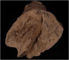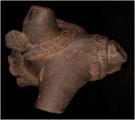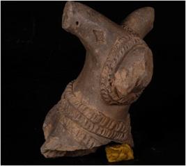 | Description / विवरण | Head portion of a handmade terracotta Bull figurine with broken horns. Body portion missing from the neck. Decorated with incised bands around the neck and horns. Ear with incised decoration and a punch mark on forehead. A transverse perforation on the snout and incised geometric eyes. |