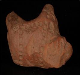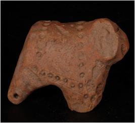 | Description / विवरण | Handmade terracotta Elephant figurine with broken trunk. Fore legs broken. Body decorated with circular stamp designs and hind leg with perforation. |