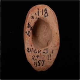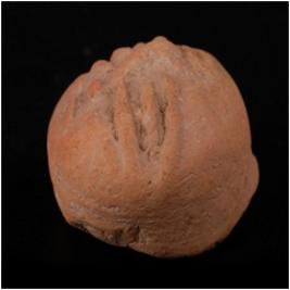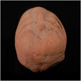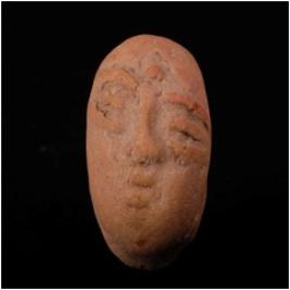 | Description / विवरण | Handmade terracotta human head of male figure, hollow from inside, a dot on forehead indicated as vermillion, pellet eyes and crude face. |