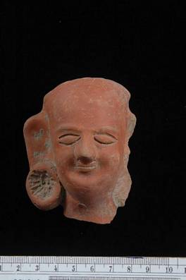 | Description / विवरण | Terracotta head with four holes at the top of the head. It wears cup shaped earrings in its right ear. Left ear lost. Hair are not indicated. Prominent nose. |