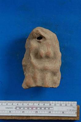 | Description / विवरण | Thick plaque showing a female torso. There is a hole at the mouth. |