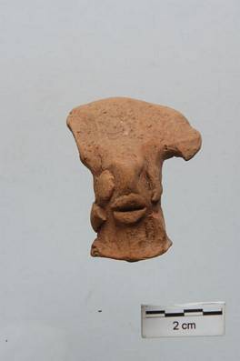 | Description / विवरण | Head of female figure . Face is made of press technique to give the shape of nose and eyes. Thick lips and eye balls are made of applique style. Mouth is slightly open. Flat headgear covered the head . |