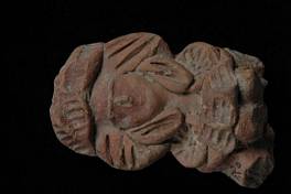 | Description / विवरण | Terracotta female bust wearing a pagree with several lines. Semi circular designs are also stamped on the applied neck ornament. It wears cup shaped ear ornaments with floral motifs stamped on them. Nose injured. |