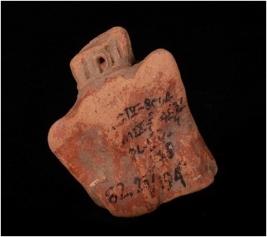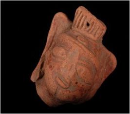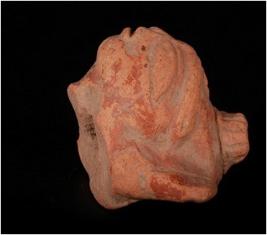 | Description / विवरण | Terracotta moulded crude female head with incised eyebrows,elongated eyes, nose and slit mouth. Rectangular elongated head dress with incised vertical lines and perforation in the centre and dow on forehead. |