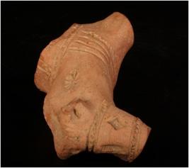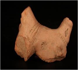 | Description / विवरण | Terracotta handmade bust of horse with deep incised lozenge eyes and impressed chakra around manes on both sides. Incised horizontal lines and pierced decoration on neck with incised decorated manes. Snout partly broken. |