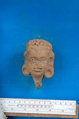 | Description / विवरण | Terracotta head having a tenon at the neck. There is decoration above his forehead and a rosette stuck up at forehead. Eyes and nose damaged. |