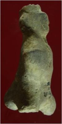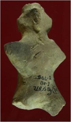 | Description / विवरण | Trench BX-1, Depth 3.95 mtrs, Stratum Pit 1A sealed by Layer 3C The object which is made of baked clay, mud brown coloured, depict as a human figurine or may be the object can be identified as a monkey figure because of the indication of broken tail. The damaged head also indicate a prominent nose on object. Although object is broken from its shoulder and the waist portion is lost. Suggestion of head gear may be embraced as crown of figurine. |