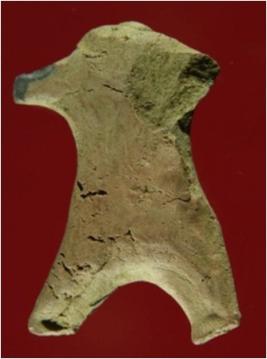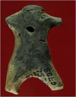 Trench ZA1,QDT-2, Depth 8.30 mtrs B peg B1, Stratum Pit 9 sealed by Layer 19 It is a broken human figurine with a hole mark at its back. It is broken from its legs and arm. Head is also broken and lost. It has a hole mark in neck used as socket to attach head with neck. An another pit mark near the waist is shown. Surface of object is rough and craggy. Colour of object is mud brown and grey.