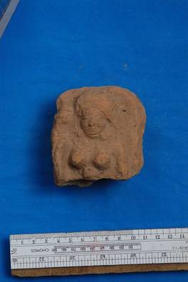 | Description / विवरण | Fragment from a thick plaque showing the bust of a female. She holds some object in her upraised right hand. |