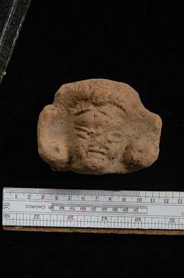 | Description / विवरण | Crude terracotta head with long and wide thick ears. Face badly defaced. There is a circular ornament shown on the forehead. |