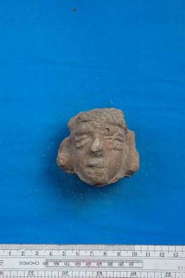 | Description / विवरण | Terracotta head with an applied urna mark on the forehead. Nose, mouth and ears injured. |
