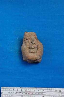 | Description / विवरण | Terracotta face with wide open mouth. Left eye, the ears and part above forehead lost. Nose injured. |