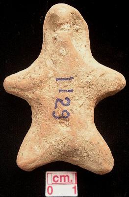| Description / विवरण | A terracotta archaic human figurine with round head, pinched nose, punched eyes, slit open mouth, short out stretched stumpy arms, short wide bridged stumpy legs, punched navel, handmade. |