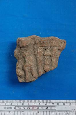 | Description / विवरण | Fragment of a plaque showing the lower portion of a female figure. A dwarfish figure is also seen on its right side. |