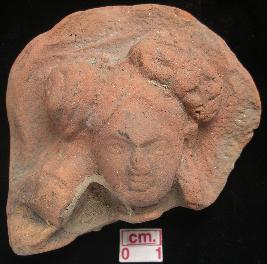 | Description / विवरण | A well decorated terracotta female figurine, red in colour, made by single mould, hair decorated with four lines of string of beads and two hair coiled both sides, beautiful face shows lotus eyes, prominent nose, smiling lips, portion below neck is broken and missing, back side is flat traces of red slip seen. |