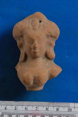 | Description / विवरण | Female bust. Hair arranged and parted in the middle by an ornament. Hands lost. |