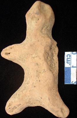 | Description / विवरण | A terracotta archaic human figurine with elongated round head, pinched nose, open slit mouth, out stretched stumpy left arm with two incised lines but right is missing, short wide bridged stumpy legs with two incised lines, devoid of any surface treatment, dull red, handmade. |