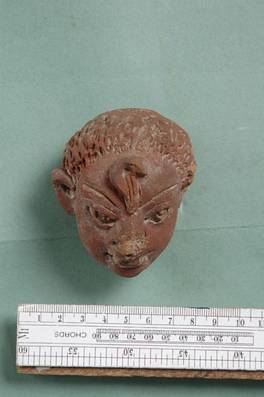 | Description / विवरण | Terracotta head with hair arranged backside in honey comb style. There is a snake like symbol applied on the fore head in place of urna. Left ear lost. Nose highly damaged Painted with a brown slip. |