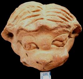 | Description / विवरण | Terracotta head of wammana, incised eyes and eyebrows, ears and nostils by hole and both the lips are seprated by a groove, combed hair, red.. |