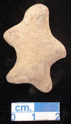 | Description / विवरण | A very small star shape archaic human terracotta figurine, dull red, pinched nose, short out stretched arms, short wide bridged stumpy legs, handmade. |