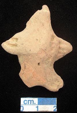 | Description / विवरण | A star shape archaic human terracotta figurine with broken head, red, very small open slit mouth, short out stretched arms with two incised line in each, traces of navel, short wide bridged stumpy legs with two incised line but right one is broken, treated with red wash, handmade. |