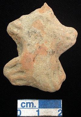 | Description / विवरण | A terracotta archaic human figurine with round head which is slightly damaged, punched eyes, pinched nose, open slit mouth, punched navel, both arms and left leg is damaged where as right one wide bridged stumpy, treated with red wash. |