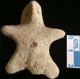 | Description / विवरण | An archaic male terracotta figurine, dullred, punched nose, pinched eyes, slit open mouth, short out stretched arms and legs, pinhole navel, phallus indicated, handmade. |