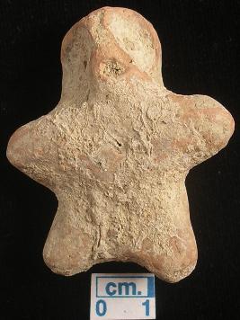 | Description / विवरण | A terracotta archaic shaped human figurine, dull red, pinched nose, pin hole eyes, slit open mouth, short out stretched arms, short wide bridged legs, handmade. |