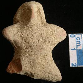 | Description / विवरण | An archaic human terracotta figurine, red, punched nose, pinched eyes, slit open mouth, short out stretched arms and legs, handmade. |