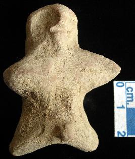 | Description / विवरण | An archaic male terracotta figurine, dullred, punched nose, pinched eyes, slit open mouth, short out stretched arms and legs, handmade. |