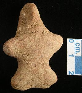 | Description / विवरण | An archaic human terracotta figurine, red, punched nose, pinched eyes, slit open mouth, short out stretched arms and legs, handmade. |