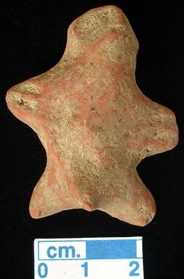 | Description / विवरण | An star shape archaic male terracotta figurine with round head, red, pinched nose, slit mouth, short out stretched arms with two incised lines on each, short wide bridged stumpy legs with one incised line on left one, treated with red wash, handmade. |