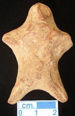| Description / विवरण | An archaic human terracotta figurine with round head, red, pinched nose, short out stretched arms with two incised lines on each but the left one is slightly broken, short wide bridged stumpy legs with two incised line on each, treated with red wash, handmade. |
